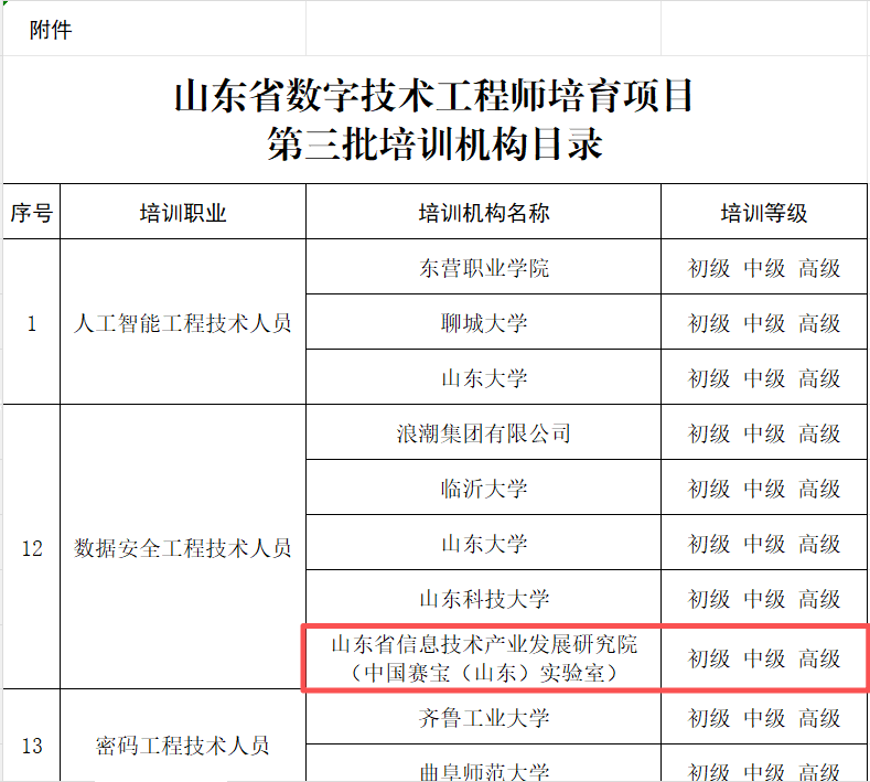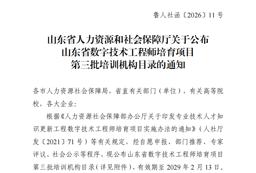 近日,山东省人力资源和社会保障厅发布鲁人社函〔2026〕11号文件,正式公布山东省数字技术工程师培育项目第三批培训机构目录。经过单位申报、专家评审等层层严苛筛选,我院数据安全工程技术人员(初、中、高级)职业培训项目成功入选,跻身全省高水平数字人才培育阵营。 此次资质申报过程中,我院高度重视、周密部署,全力以赴做好各项筹备工作。申报阶段,全面梳理各类支撑材料,精准对接培育要求,完善培训场地与设备设施,筑牢培育基础;现场评审阶段,精心筹备专题汇报,主动配合专家组实地考察,全面展现我院的培训实力与专业素养,得到专家组的充分肯定与高度认可。 数据安全是数字经济发展的基石,人才是筑牢安全屏障的核心力量。我院将以此次入选为契机,严格遵循项目相关要求,进一步完善培训体系、优化课程内容、强化师资队伍建设,规范开展线上线下一体化培训,做好学员结业考核与证书发放工作,确保培训质量。 下一步,我院将主动担当、积极作为,紧扣我省数字产业发展需求,丰富培训内容、创新培育模式,探索数字人才自主培养新路径,以高质量人才培育服务,助力数字产业化与产业数字化深度融合,为山东打造数字人才发展新生态、推动数字经济高质量发展贡献坚实力量!